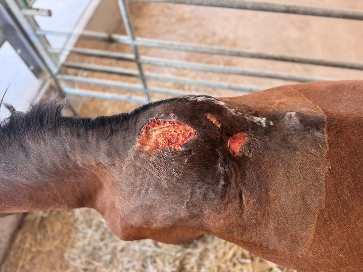 Arrivé le 6 juin 2025 au Rêve d’Aby, notre courageux poney se bat depuis contre une lourde blessure, conséquence d’un abcès énorme jamais soigné par ses anciens détenteurs. Cet abcès a provoqué de la nécrose osseuse et ligamentaire. Après une première opération, tout semblait bien évoluer, la plaie cicatrisait et la guérison avançait correctement.