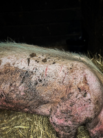 L’état sanitaire de nos deux nouveaux protégés est déplorable : inflammations des membres, jarrets gonflés, difficultés à se déplacer, blessures infectées et non soignées. Les conditions de vie dégradantes dans lesquelles ils étaient maintenus entraînent des troubles du comportement, les cochons se battent entre eux, ou se blessent parfois même seul par ennui.