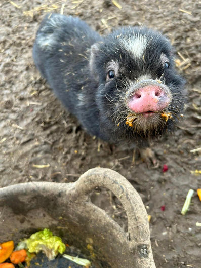 Owen est arrivée au refuge suite à une grosse intervention sur Bastogne. Un individu isolé s’est laissé déborder par le nombre d’animaux détenu sur sa propriété. Le propriétaire était à l’origine détenteur de trois cochons vietnamiens et n’a pas contrôlé la reproduction de son groupe. Sur place, les refuges constatent que le lieu de détention est bel et bien inadapté à un tel nombre d’animaux et que les cochons ne reçoivent pas les soins nécessaires. Les cochons n’ont pas de litière et doivent se contenter de quelques bassines d’eau et de farine en guise de nourriture.